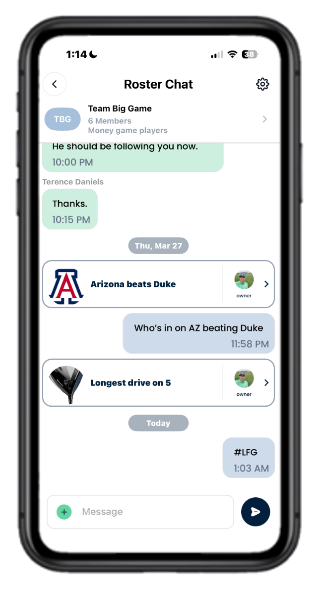 Big Game makes competition effortless. Create a round, invite friends, and set up side action in seconds. Score live, talk smack in chat, and settle when the game’s done.
